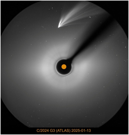 Su proximidad al Sol los días previos y posteriores a su perihelio, hicieron como se esperaba, que el cometa C/2024 G3 (ATLAS), desarrollara un gran brillo y una larga y vistosa cola, que en esos días, solo pudo ser captada por el Coronógrafo LASCO C3, un instrumento científico para la observación del entorno próximo a nuestra estrella, el cual está instalado en el Observatorio Solar y Heliosférico, SOHO, por sus iniciales en inglés. Esos días la magnitud del cometa alcanzó un brillo de -4, incluso -5, si se consideraba el efecto de dispersión hacia adelante, que coincidía en ángulo y dirección con el desplazamiento del cometa. Lo cierto es que para el 14 y 15 de enero, el cometa era tan brillante, que desde muchos lugares de la Tierra pudo ser observado a simple vista o con binoculares a plena luz del día, teniendo las precauciones de rigor por su extrema cercanía al Sol.