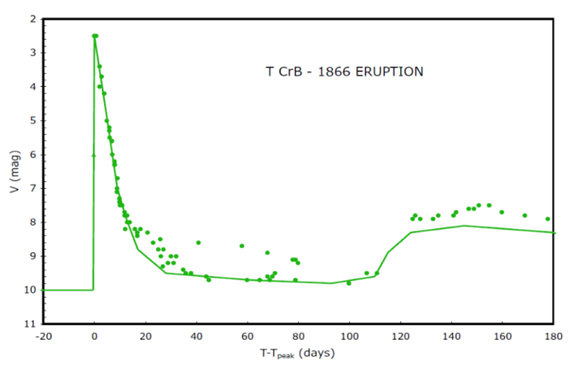 De acuerdo con Schaefer (2010): Esta curva de luz muestra las magnitudes de la banda B (rombos) y V (círculos) sólo para el pico principal (...). El pico elegido fue de V = 2.5, que corresponde a la magnitud más brillante observada para el estallido de 1866. El pico primario de T CrB corresponde a una curva de luz muy rápida (Schaefer, 2010, p. 311).