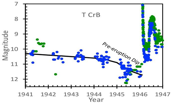 Investigaciones anteriores han probado que el aumento de brillo que ha presentado T CrB desde su estado más bajo (1954,5 a 2015,0) a su estado más alto (2015,0 al presente) es un precursor y presagio de una erupción próxima alrededor de 2025,5 ± 1,3 aproximadamente (Munari et al. 2016; Schaefer 2023). La caída de magnitud entre 1945 y 1946 comenzó alrededor de 1945.0 (1,1 ± 0,3 años antes de la erupción de 1946), y la magnitud de la banda B disminuyó de cerca de 10,5 a 12,0 mag, mientras que la magnitud de la banda V disminuyó de cerca de 9,8 a 12,3 mag. Esta disminución terminó abruptamente con la erupción de la nova.