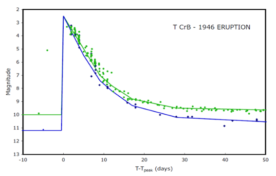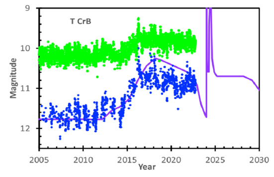 La curva de luz es un acercamiento a la de la Fig. 9, representando las magnitudes V en verde y las B en azul, con datos hasta 2022,8. La plantilla de la banda B de los años que rodean la erupción de 1946 se muestra como una curva púrpura, aunque representada aquí con un cambio en los años de modo que el pico de la erupción primaria se encuentra en el año 2024.0 (...) A pesar de esta expectativa, esta figura muestra que el estado alto actual tiene una amplitud menor que el anterior a la erupción de 1946, y esta modesta diferencia en la forma permite posibles diferencias modestas en el tiempo. La figura muestra la plantilla desplazada de modo que las subidas en torno a 1936 y 2015 se solapan, lo que implica una fecha de erupción de 2023,8. Pero la caída previa a la erupción no ha comenzado, en febrero de 2023, por lo que la erupción debería producirse después de 2024,2. El hecho de que el estado alto actual sea de media magnitud inferior al de la plantilla sugiere la posibilidad de que la duración del estado alto actual previo a la erupción sea algo mayor que en la plantilla, quizás 2-3 años. En este caso, el año de erupción estaría entre 2024.2 y 2026.8, o 2025.5 ± 1.3 (Schaefer, 2023, p. 3156).
