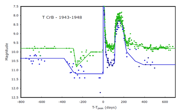 Schaefer (2010) destaca que: Esta curva de luz muestra las magnitudes de la banda B (rombos) y de la banda V (círculos) durante un largo periodo alrededor de la erupción de 1946. Esta curva de luz extendida muestra dos fenómenos únicos y aún no explicados. En primer lugar, la curva de luz presenta una caída significativa y de larga duración antes de la erupción, en la que los colores cambian a lo largo del tiempo. Para que se produjera esta caída, la estrella gigante roja tendría que haber perdido intensidad luminosidad de acreción en gran medida. Otro problema es que si la depresión está relacionada con la erupción, entonces debemos explicar por qué el desencadenamiento de la nova (relacionado con la acumulación de materia en la superficie de la enana blanca) tiene un oscurecimiento (relacionado con el disco de acreción o con la gigante roja compañera) poco después. En segundo lugar, después de que T CrB haya vuelto a la inactividad durante unos 50 días, de repente vuelve a brillar hasta alcanzar la octava magnitud. Este aumento no se ha observado en ninguna otra nova. (p. 311).