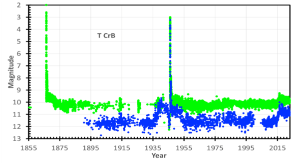 Todas las observaciones de las bandas B y V se muestran mediante los círculos azul y verde, respectivamente. Vemos las dos erupciones en 1866 y 1946, llegando hasta V = 2,0 (...). Vemos que B − V varía con un valor típico alrededor de 1,2 mag. Lo más importante es que este gráfico, o su equivalente, es la única manera de ver los complejos estados superiores desde 1866-1875, 1936-1955 y 2015-presente. Estos estados elevados son los mismos de una erupción a otra. Los estados altos consisten principalmente en luz azul, prominentes en B y sólo perceptibles en V. El estado alto previo a la erupción comienza casi 10 años antes de la erupción, por lo que el estado alto que comienza alrededor de 2015 implica una próxima tercera erupción alrededor del año 2025. La caída previa a la erupción proporcionará un aviso inmediato de una con unos meses antes de la próxima erupción. La erupción secundaria de 1866 y 1946 se pierde con la erupción primaria en esta escala horizontal comprimida. El estado alto tiene la misma energía total que las erupciones de nova clásicas, mientras que el estado alto T CrB es único (Schaefer, 2023, p. 3150).