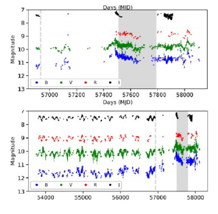 Según los estudios realizados por Linford et al. (2019): Las regiones grises indican el periodo de tiempo de nuestras observaciones del VLA. La línea gris discontinua vertical indica la única observación VLA de 2014. Arriba: del 1 de enero de 2006 al 20 de diciembre de 2017. Debajo: del 1 de septiembre de 2014 al 20 de diciembre de 2017 (p. 2).