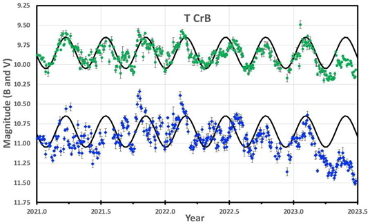 Este gráfico tiene 4.330 magnitudes de banda B de Johnson (rombos azules) y 12.734 magnitudes de banda V de Johnson (rombos verdes), todas con cámaras CCD de 2021.0 a 2023.5, todas agrupadas en intervalos de tiempo de 2 días. Las modulaciones elipsoidales habituales (~0,4 mag de amplitud completa como una onda sinusoidal a la mitad del período orbital) se muestran como curvas negras gruesas, una para cada una de las bandas. El objetivo de este gráfico es ver que el brillo de T CrB se ha ido desvaneciendo sistemáticamente con respecto a su promedio a largo plazo. Actualmente, T CrB es 0,8 magnitudes más débil de lo esperado en la banda B y 0,35 magnitudes más débil de lo esperado en la banda V. Este gráfico demuestra que T CrB se encuentra en su esperado descenso previo a la erupción, que comenzó en algún momento alrededor de fines de marzo de 2023 (Schaefer et al., 2023).