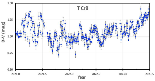 El oscurecimiento de T CrB es más rápido en la banda B que en la banda V (Figura 7). Esto se puede representar mediante este gráfico de BV de 2021.0-2023.5. Antes de 2023.25, el color de T CrB fluctúa alrededor de BV = 1.05, con variaciones normales y generalmente ligadas al ciclo elipsoidal. Pero después de 2023.25, el BV aumenta sistemáticamente de 1.08 a 1.41 en solo un cuarto de año. Las curvas de luz AAVSO para las bandas R e I también muestran el Dip Pre-erupción, pero solo a una tasa de desvanecimiento sustancialmente menor. Este enrojecimiento de los colores (mayor en B, sustancial en V, pequeño en R e I) es característico de la extinción del polvo. Por lo tanto, el objetivo de este gráfico es mostrar que el oscurecimiento del Dip Pre-erupción es mayor en la banda B y disminuye hacia las bandas más rojas (Schaefer et al., 2023).
