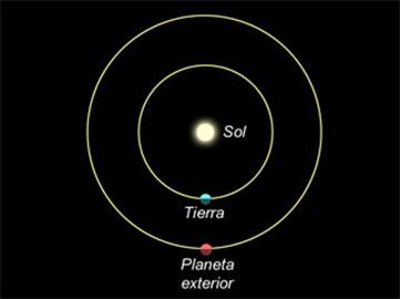 Fig. 1. Posiciones de los cuerpos para una Oposición planetaria. Para este caso, el planeta exterior es Marte.
