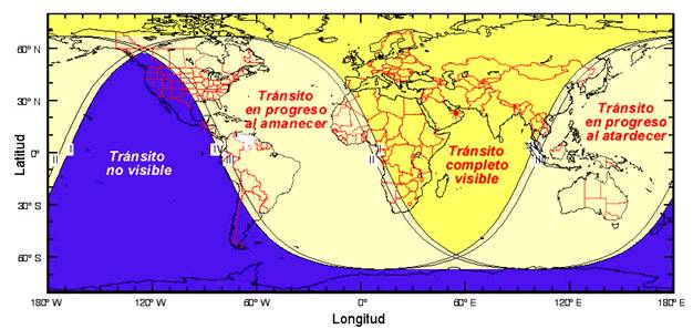 El gráfico mostrado a continuación presenta las circunstancias del tránsito de Venus para este año. En Venezuela se podrá ver el evento en el amanecer del día 8. Como se puede observar en el Mapamundi, Europa es la zona privilegiada, pues podrá ser observado casi en toda su extensión.