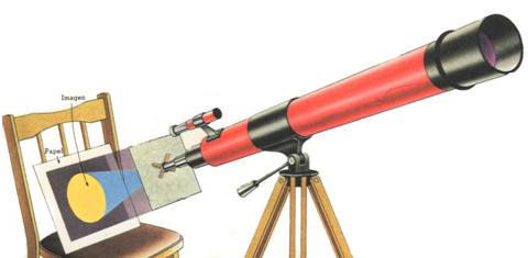 Métodos de proyectar la imagen del Sol con telescopios. Este método es uno de los más seguros para no dañar los ojos.
