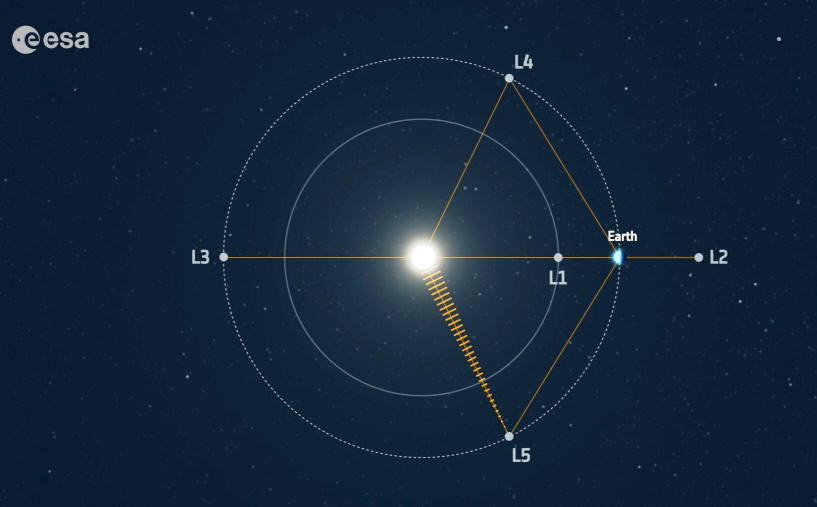 Hay ubicaciones alrededor de la órbita de un planeta donde las fuerzas gravitatorias y el movimiento orbital del Sol y el planeta interactúan para crear una ubicación estable, desde donde una nave espacial puede residir con poco esfuerzo de los operadores en tierra para mantenerla en su lugar. Estos puntos se conocen como puntos Lagrangianos o 'L', en honor al astrónomo y matemático italiano del siglo XVIII Joseph-Louis Lagrange (nacido como Giuseppe Luigi Lagrancia). Vistos desde el Sol, los puntos L4 y L5 se encuentran a 60 grados por delante y por detrás de la Tierra, cerca de su órbita. A diferencia de los otros puntos de Lagrange, L4 y L5 son resistentes a las perturbaciones gravitatorias. Debido a esta estabilidad, los objetos como el polvo y los asteroides tienden a acumularse en estas regiones. En L4 o L5, una nave espacial es realmente estable, como una pelota en un tazón grande. Crédito: ESA.