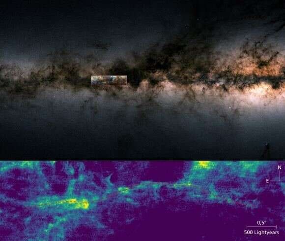 ![]() La sección de la Vía Láctea, medida por el satélite Gaia de la ESA (arriba). El cuadro marca la ubicación del filamento "Maggie" y la imagen en falso color de la distribución del hidrógeno atómico (parte inferior), la línea roja indica el filamento "Maggie". Crédito: ESA / Gaia / DPAC / T. Müller / J. Syed / MPIA.