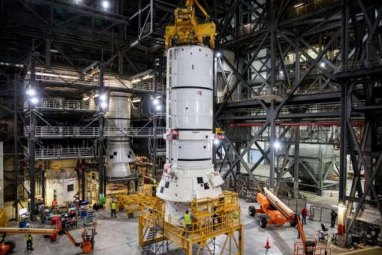 ![]() Los propulsores de cohetes para el Space Launch System que lanzará la misión Artemis I de la NASA a la luna. Crédito: NASA / Kim Shiflett.