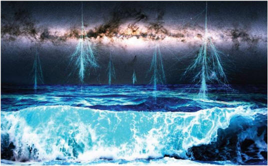 ![]() Ilustración de la Vía Láctea vista desde la Tierra donde la supernova acelera los rayos cósmicos a altas energías. Algunas de estas partículas de rayos cósmicos ingresan a la atmósfera de la Tierra, donde producen estructuras de lluvia de partículas secundarias. Un resultado sorprendente es que los cambios en los rayos cósmicos a lo largo de la historia de la Tierra han influido en la vida en la Tierra. Crédito: H. Svensmark / DTU Space.