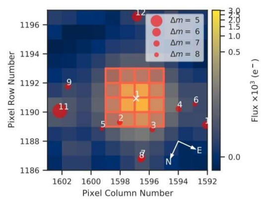 ![]() Archivos de píxeles objetivo TESS de los Sectores 14, 20, 21 y 26 que observaron TOI-2257, generados mediante tpfplotter (Aller et al. 2020). Las aberturas utilizadas para extraer la fotometría por la tubería SPOC se muestran como regiones sombreadas en rojo. El catálogo de Gaia DR2 (Gaia Collaboration 2018) está sobretrazado, con todas las fuentes de hasta 6 magnitudes en contraste con TOI-2257 mostradas como círculos rojos. Notamos que el tamaño del símbolo escala con el contraste de magnitud. Si bien la estrella está relativamente aislada, hay una pequeña cantidad de contaminación de fuentes externas, que oscila entre el 2% y el 5% del flujo total. Crédito: DOI: 10.1051/0004-6361/202142280.