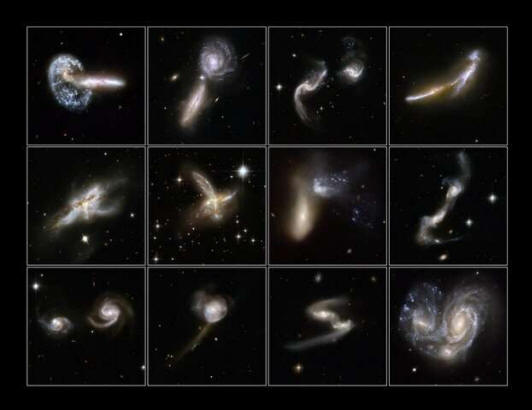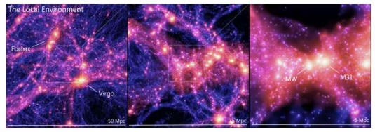 Uno de los rasgos característicos de la cosmología moderna es su descripción de cómo evolucionan las galaxias: a través de un proceso jerárquico de colisión y fusión con otros sistemas. En ninguna parte del Universo tenemos una visión más clara de esta acumulación que en nuestra propia Vía Láctea. Actualmente, uno de nuestros vecinos cercanos, la galaxia enana de Sagitario, está siendo interrumpida por las mareas (una galaxia enana tiene menos del 1% de la masa estelar de una galaxia espiral normal como la Vía Láctea y, a menudo, mucho menos). Otras dos enanas cercanas, la Gran y la Pequeña Nube de Magallanes (con aproximadamente el 1% y el 0,7% de la masa estelar de la Vía Láctea, respectivamente) están cayendo hacia nosotros. Mientras tanto, corrientes de cúmulos globulares rodean la Galaxia, marcando los efectos de fusiones anteriores. El registro de fusiones aún más antiguas se puede extraer de las posiciones y movimientos de las estrellas en el halo estelar de la Vía Láctea, la distribución aproximadamente esférica de estrellas (alrededor de cien mil años luz de diámetro) de más de 10 a 12 mil millones de años. Mientras tanto, Andrómeda, nuestra gran galaxia vecina más cercana, está unas diez veces más lejos que estas enanas; se espera una fusión con ella en unos cinco mil millones de años.