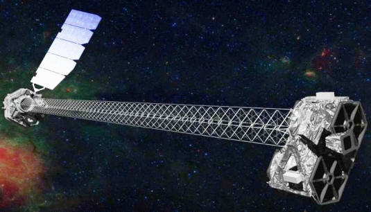 ![]() El aparato del tamaño de una cancha de tenis, en forma de cometa, actúa como una sombrilla, asegurando que el observatorio se mantenga a la sombra para que sea capaz de detectar débiles señales infrarrojas de los confines del Universo. |