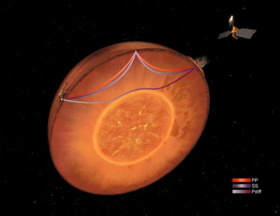 ![]() Impresión artística de una pluma de manto activa, una gran masa de roca cálida y flotante, que se eleva desde las profundidades de Marte y empuja hacia Elysium Planitia, una llanura dentro de las tierras bajas del norte del planeta. El vulcanismo en Elysium Planitia se origina en Cerberus Fossae, resaltado en rojo, un conjunto de fisuras jóvenes que se extiende por más de 800 millas a través de la superficie marciana. Recientemente, el módulo de aterrizaje InSight de la NASA descubrió que casi todos los terremotos marcianos, o marsquakes, emanan de esta región. Crédito: Adrien Broquet y Audrey Lasbordes.