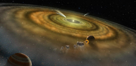 ![]() La ilustración de este artista muestra la ubicación y el tamaño de una hipotética nube de polvo que rodea el Sistema Solar. Los astrónomos buscaron en 200.000 imágenes e hicieron decenas de miles de mediciones desde el Telescopio Espacial Hubble para descubrir un resplandor de fondo residual en el cielo. Debido a que el brillo se distribuye tan suavemente, la fuente probable son innumerables cometas: bolas de nieve polvorientas que vuelan libremente. Caen hacia el Sol desde todas las direcciones diferentes, arrojando un escape de polvo a medida que los hielos se subliman debido al calor del Sol. De ser real, sería un elemento arquitectónico recién descubierto del Sistema Solar. Crédito: NASA, ESA, Andi James (STScI).