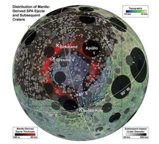 ![]() La cuenca de impacto más grande en la Luna es la cuenca Aitken del Polo Sur. Esta y otras cuencas de impacto fueron creadas por planetesimales según un nuevo estudio. Crédito: Moriarty et al., 2021.