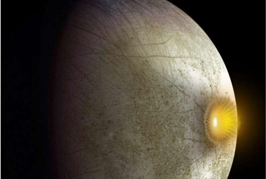 ![]() Concepto artístico del impacto de un cometa o asteroide en la luna Europa de Júpiter. Crédito: NASA/JPL-Caltech