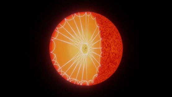 ![]() Impresión artística de ondas, con diferentes frecuencias, viajando en las capas internas de una estrella. Los modos P, u ondas de sonido puro (presión), en blanco, pasan la mayor parte de su tiempo en la envoltura exterior y son directamente visibles en la superficie de las estrellas. Los modos G, u ondas de gravedad pura, en negro, se propagan en el interior radiativo y contienen información sobre el núcleo estelar. En las gigantes rojas, las dos están acopladas y las ondas resultantes detectan todas las capas, revelando así información del interior más profundo de las estrellas. Crédito: Tania Cunha (Planetário do Porto - Centro Ciência Viva)/Instituto de Astrofísica e Ciências do Espaço.