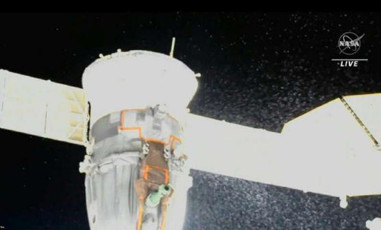 ![]() Esta foto sin fecha tomada por el cosmonauta ruso Sergei Korsakov y publicada por la Corporación Espacial Estatal de Roscosmos muestra una cápsula Soyuz en la Estación Espacial Internacional (ISS). La corporación espacial rusa Roscosmos dijo que una fuga de refrigerante de una cápsula espacial rusa conectada a la Estación Espacial Internacional que llevó a un par de cosmonautas rusos a abortar una caminata espacial planeada probablemente fue causada por un micrometeorito. Crédito: Sergei Korsakov, Roscosmos State Space Corporation vía AP.