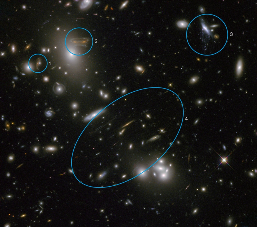 Las etiquetas 1 y 2 muestran dos imágenes magnificadas de la misma galaxia de fondo. La etiquetada con el número 2 es conocida como el invasor del espacio profundo, por su semejanza con algunas caricaturas de extraterrestres. La galaxia etiquetada como 3 es una galaxia miembro del cúmulo que no se encuentra magnificada, pero que es despojada de su gas debido a que se desplaza por un medio intergaláctico más denso. La numerada con 4 nos muestra los arcos producidos por objetos situados en el fondo, distorsionados por la lente gravitacional.