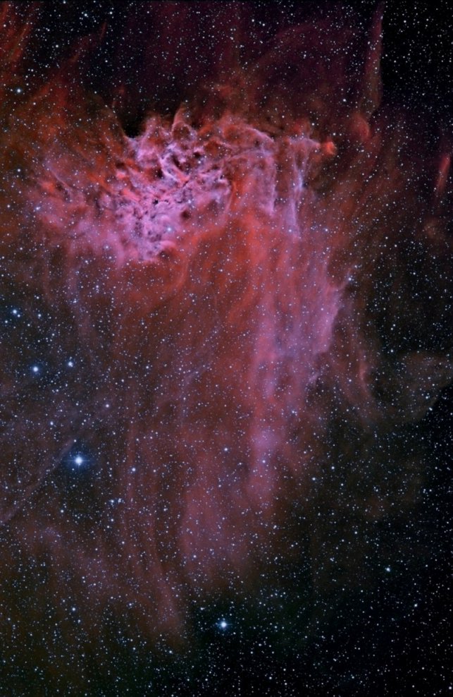 En la constelación de Cochero (Auriga), casi en el centro de recorrido entre el cúmulo estelar abierto M38 y la estrella iota Aurigae, se encuentra la estrella variable AE Aurigae y la nebulosa de la estrella flameante IC 405. Este extraordinario complejo celeste es el encuentro casual de una estrella de rápido movimiento y una nube de gas hidrógeno molecular. La estrella AE Aurigae, la más brillante casi en el centro de la nebulosa, es una gigante azul, con temperatura superficial de 33.000 K y unas 30.000 veces más brillante que nuestro Sol. Su rápido movimiento la hizo coincidir con la nube molecular. Cuando los protones capturan electrones, frecuentemente emiten luz roja, tal como podemos observar en esta nebulosa de reflexión. También se pueden observar filamentos oscuros, señal de presencia de granos de polvo, ricos en carbono. La nebulosa se encuentra a unos 1.500 años-luz y se extiende por unos 5 años-luz. Es observable con telescopios pequeños y binoculares.