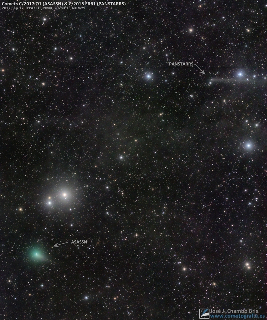 En el mismo campo de visión telescópica, en la parte superior derecha, se encuentra el cometa C/2015 ER61 PanSTARRS. Su delgada y larga cola contrasta con la del otro cometa. Para ese instante, este cometa se encontraba a 14 minutos-luz de nosotros.