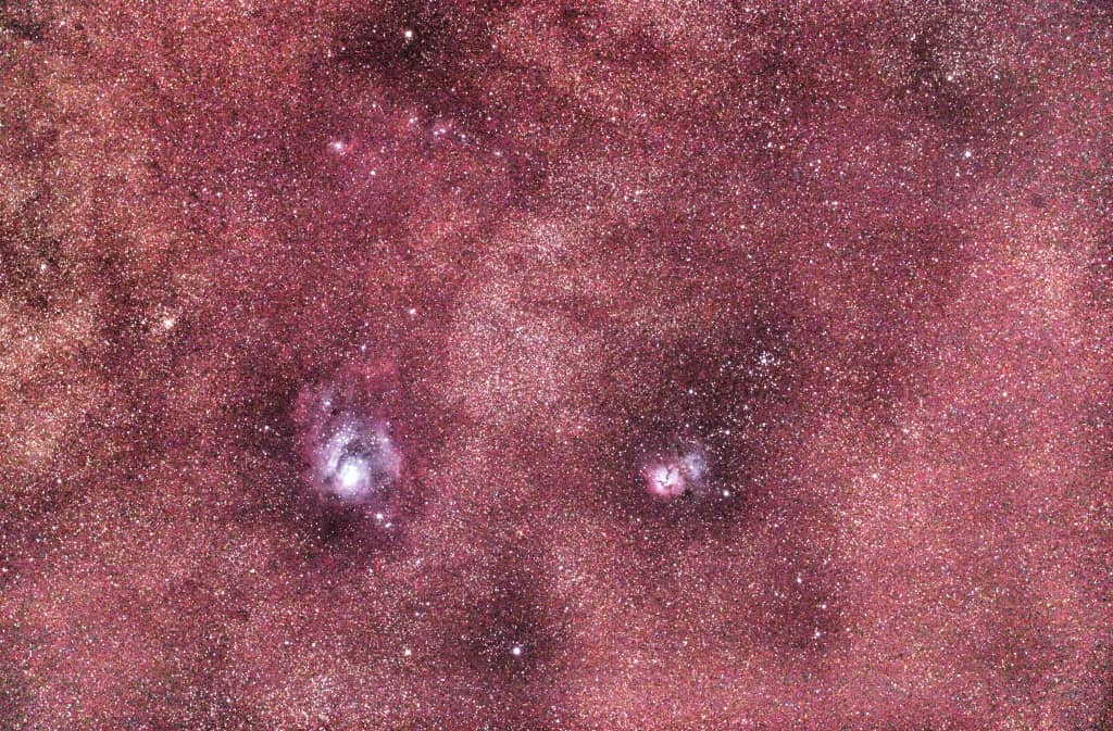 Estas nebulosas, la Laguna (M8, NGC6523) - a la izquierda - y la Trífida (M20, NGC6515) completan esta excelente toma, colgadas sobre el firmamento tachonado de estrellas.