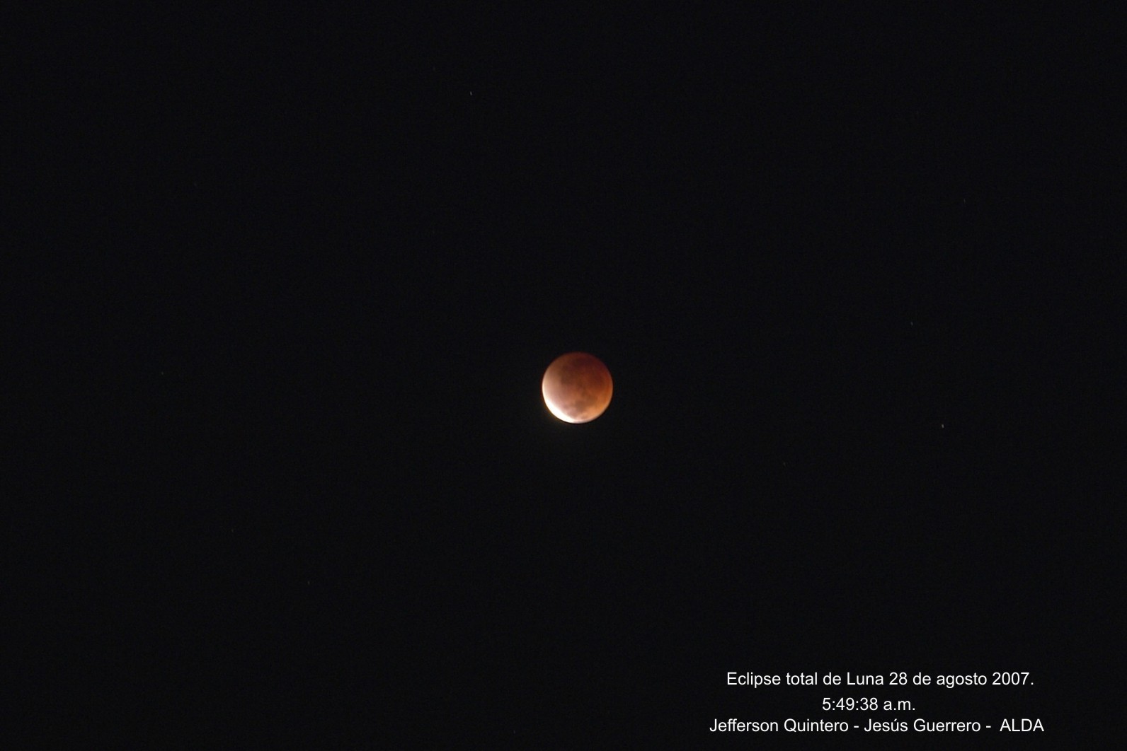 Una excelente secuencia de este singular eclipse fue lograda desde la península de Paraguaná, estado Falcón, Venezuela, por miembros y amigos de la Asociación Larense de Astronomía, ALDA. Con unas características especiales, desde Venezuela sólo podría ser visto, desde tempranas horas de la madrugada, las fases iniciales e intermedias del mismo. El eclipse no fue brillante. Se confabuló para este resultado la trayectoria de la Luna en el cono de sombra y lo próximo del amanecer. Sin embargo, logró pintarse de rojo cobrizo y marrón oscuro. La imagen, obtenida con 5 segundos de exposición, se corresponde con las etapas finales de parcialidad, cuando nuestro satélite natural inicia su tránsito en el cono de Umbra de la Tierra. Amanecía y el fondo del cielo comenzaba a iluminarse de su azul característico.