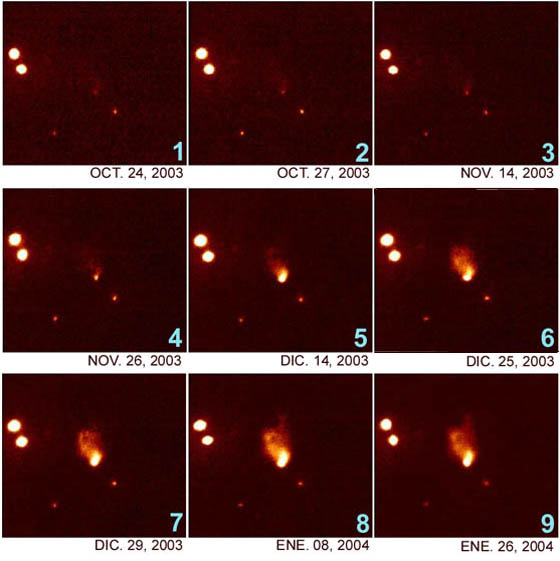 No es precisamente lo que inspiró el romántico vals de Antonio Carrillo, melodía que es casi un segundo himno de nuestro estado. Se trata de una secuencia de 9 imágenes tomadas a lo largo de 13 semanas y media entre Octubre 2003 y Enero 2004, que muestra la abrupta formación de una estrella en una zona cercana al objeto Messier 78. Lo que si tienen de criollo -y que nos llena de satisfacción- es que fueron tomadas desde Venezuela, en el Observatorio Nacional de Llano del Hato con la Cámara Schmidt, instrumento que tiene acoplado un detector digital de amplio campo con el cual un equipo de astrónomos venezolanos monitorea desde 1999 sectores celestes de especial interés tales como Orión, donde a modo de "incubadora estelar" es factible observar el "llanto" de una estrella al nacer. No es fácil. No llegan a 10 las veces que un evento similar ha podido ser registrado hasta el presente. Los estudios apuntan a identificar la erupción como del tipo "FU Orionis", donde gas y polvo acumulado en el disco circundante a un objeto protoestelar, llega a un punto de inestabilidad gravitacional y se precipita de pronto hacia el centro liberando una cantidad enorme de energía que hace aumentar el brillo del objeto inicial como en este caso hasta 100 veces. El inicio del fenómeno eruptivo es perceptible ya en las toma Nº 3 y 4, dos meses antes de que el aficionado estadounidense Jay McNeil lo reportara como aparición de una nueva nebulosa en Enero 2004, la misma que fue bautizada en su honor.