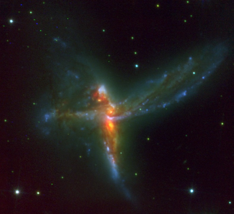 Una exposición de 30 minutos en la banda K realizada con el telescopio VLT/NACO del Observatorio Europeo del Sur, ESO, combinada con imágenes de la Cámara de Amplio Campo del telescopio espacial Hubble, realizadas en la banda I del espectro, han producido esta extraordinaria imagen de una descomunal colisión cósmica.