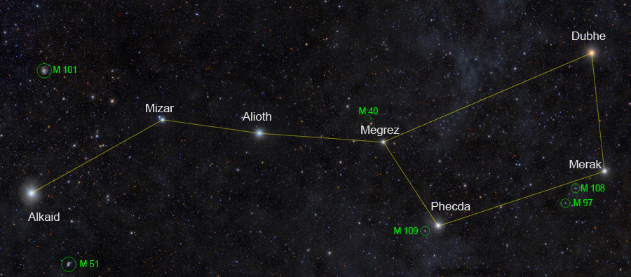 Para esta época se encuentra descendiendo en el cielo de la noche, pero siempre es llamativo este conjunto de estrellas brillantes, sobre todo Merak y Dubhe, cuya línea imaginaria señala a la estrella Polar y el Polo Norte Celeste.