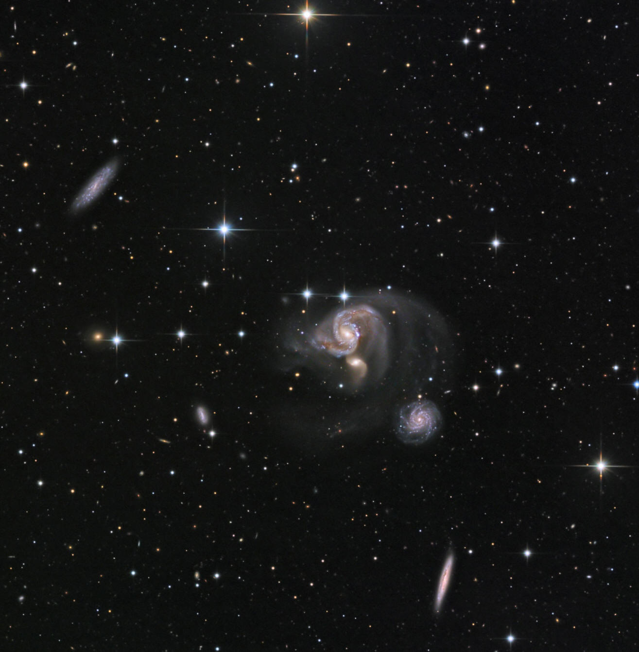 Tres galaxias espirales se encuentran interactuando, produciendo colas de marea que se extienden por más de 100.000 años-luz. Sus encuentros cercanos desencadenan una furiosa formación de estrellas.