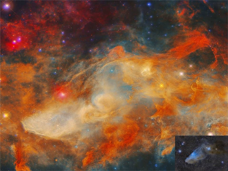 Sin embargo, en luz infrarroja, emerge un complejo laberinto de filamentos, cavernas, capullos de polvo y gas resplandeciente, que dificulta incluso la identificación del ícono equino.