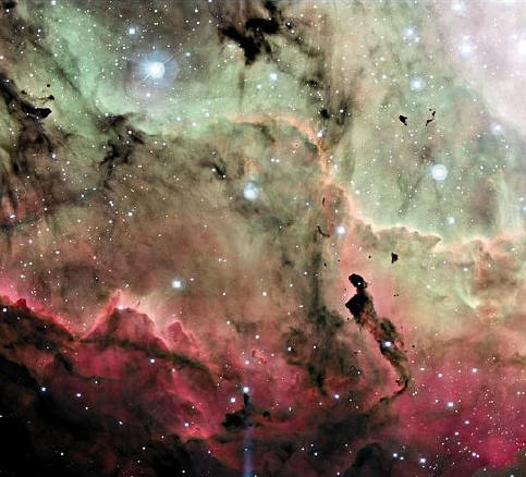 Las estrellas están batallando con el gas y el polvo en la Nebulosa de la Laguna. También conocida como M8, esta fotogénica nebulosa es observable a simple vista en la constelación de Sagitario. Los procesos energéticos de formación de estrellas, no solo crean el color sino también el caos. El gas rojo resplandeciente es el resultado del choque entre las partículas de alta energía de las estrellas y el gas hidrógeno interestelar. Los filamentos de polvo oscuro que atan a M8 se crearon en las atmósferas de estrellas gigantes frías y en los restos de explosiones de supernovas. Esta porción espectacular de la nebulosa de la Laguna fue tomada por el CFHT, que muestra en rojo, la luz emitida por el hidrógeno y en verde, la del oxigeno. Esta nebulosa se encuentra a unos 5.000 años-luz y la sección fotografiada tiene un tamaño de unos 50 años-luz.