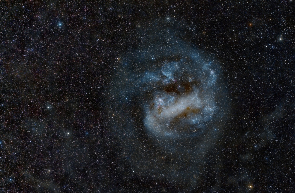 Tres horas de exposición y nuevas técnicas en el procesamiento de imágenes han producido esta detallada imagen de la LMC en donde se aprecia una barra central y unos brazos espirales totalmente deformados.