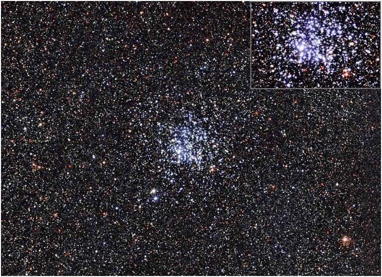 Esta hermosa y colorida imagen fue tomada por la cámara de amplio campo del telescopio MPG/ESO de 2,2 metros, ubicado en el Observatorio La Silla de ESO, en el norte de Chile. Sobre la misma, el equipo de editores de la Red Larense de Astronomía ha superpuesto un CloseUp del cúmulo.