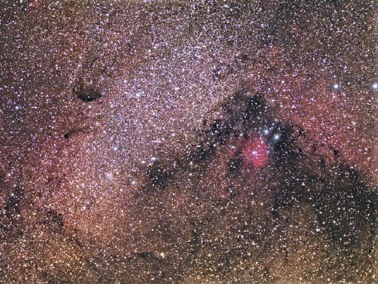 Muchos campos de estrellas en el plano de nuestra galaxia, la Vía Láctea, son ricos en nubes de polvo y gas, tal como lo muestra la figura. De estas, muchos millones de estrellas son parecidas a nuestro Sol. Gigantescos filamentos de polvo interestelar oscuro cruzan la imagen y bloquean la luz de las estrellas situadas detrás de ellas. La región de color rojo luminoso es parte de la Nebulosa Omega, nebulosa de emisión cuyo componente principal es hidrogeno caliente, conocida como M17. Una agrupación pequeña de estrellas, ubicadas hacia el centro de la imagen, es el cúmulo estelar abierto M18, mientras que el flujo brillante de estrellas situadas a la izquierda del centro se conoce como M24. Hacia el extremo izquierdo de la imagen se encuentra la nebulosa roja de emisión IC 1283, flanqueada por las dos nebulosas de reflexión azules NGC 6589 y NGC 6590. Todos estos objetos son visibles con telescopios pequeños cuando miramos en dirección de centro galáctico, en la constelación de Sagitario.