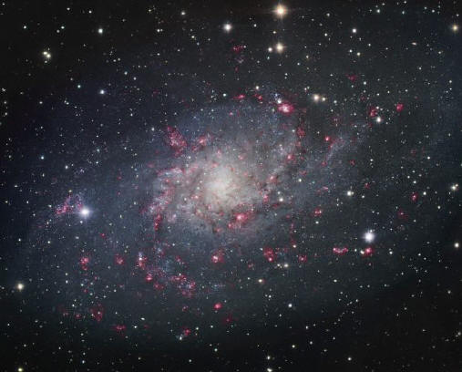 La pequeña constelación del Triángulo (Triangulum) alberga una de las más populares galaxias de nuestro cielo: la galaxia del Molino o M33. Esta galaxia espiral, a pesar de su gran tamaño (el equivalente a la Luna llena) es de difícil observación pues no contiene zonas muy brillantes, lo que no produce mucho contraste en el cielo. Se requiere de una noche muy oscura y unos binoculares con amplio campo, para poder detectarla. Visible, temprano en las noches, hasta finales del mes de marzo, esta galaxia mide unos 50.000 años-luz de extensión y es el tercer miembro del Grupo Local de galaxias. Situada a unos 3 millones de años-luz de la Vía Láctea, su población de estrellas variables ayudó a establecer las primeras escalas para la medición de nuestro Universo.