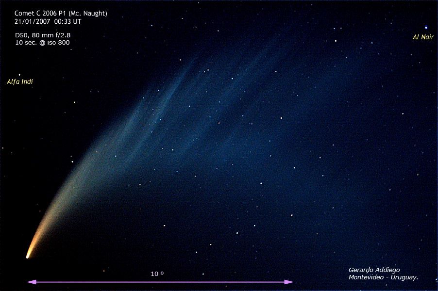 En su viaje hacia el hemisferio Sur, aunque disminuyó su brillo, compensó esa circunstancia con el despliegue de una impresionante cola, la cual se puede observar en esta excelente foto de Gerardo Addiego, desde Montevideo, Uruguay.
