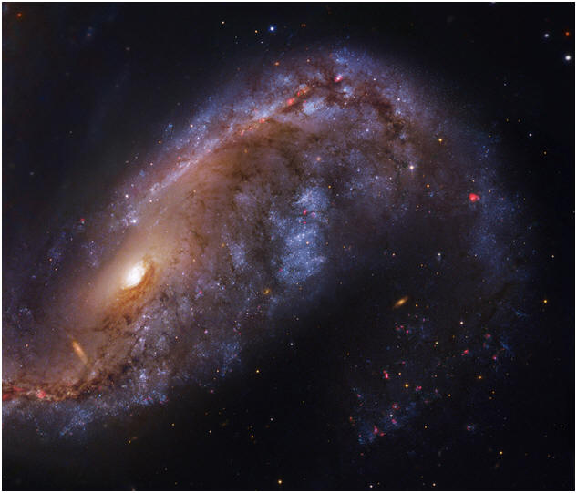 Situada a unos 50 millones de años-luz de distancia, los dos brazos espirales de la galaxia que se extienden desde una pronunciada barra central tienen una apariencia de gancho en las imágenes de amplio campo.