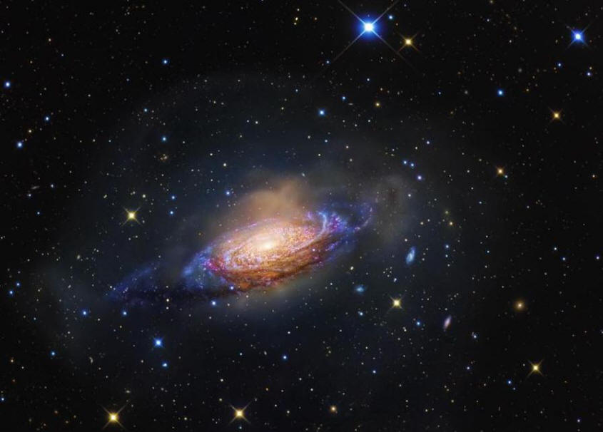 Una de las galaxias escogidas fue la Galaxia de la Burbuja (NGC3521). Localizada en la constelación de Leo, en la imagen se pueden observar las extensas cáscaras de residuos, producto de la acreción de la galaxia con una o más galaxias satélites.