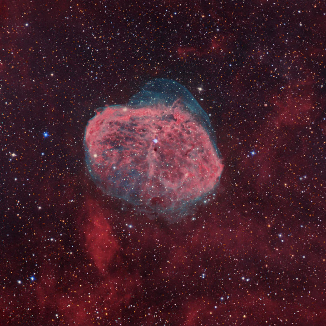 NGC 6888, también conocida como la Nebulosa Creciente, es una burbuja cósmica que tiene un tamaño de unos 25 años-luz, que se ha formado por los poderosos vientos que genera la masiva y luminosa estrella central. Esta extraordinaria vista telescópica combina una imagen compuesta con datos que aíslan la luz de los átomos de hidrógeno y oxígeno en los vientos que inflan a la nebulosa. Los átomos de oxígeno producen el color verde azulado que podemos ver en los bordes y filamentos. La estrella central de la nebulosa NGC 6888 está clasificada como una estrella Wolf-Rayet (WR 136). La estrella ha expulsado su capa externa formando un poderoso viento estelar, arrojando el equivalente a la masa del Sol cada 10.000 años. Las estructuras complejas de la nebulosa se deben a la interacción del fuerte viento estelar con las capas de materia arrojadas en las fases tempranas. Quemando el combustible a tan tremendas proporciones y estando en sus etapas finales, la fase final de esta estrella será una espectacular explosión de Supernova. Esta nebulosa se encuentra a unos 5.000 años-luz en la constelación de Cygnus.