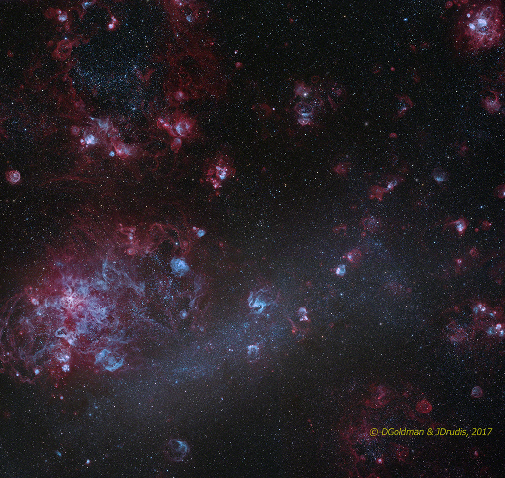 Como resultado, en esta imagen, la LMC aparece cubierta con sus propias nubes de gas ionizado que rodean a sus masivas y jóvenes estrellas. Esculpidas por los fuertes vientos estelares y la radiación ultravioleta, las nubes brillantes, dominadas por la emisión de hidrógeno, se conocen como regiones H II (hidrógeno ionizado). De todas las nubes, resalta la Nebulosa de la Tarántula, a la izquierda, compuesta por varias regiones H II superpuestas.