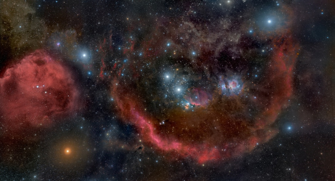 Al centro de la imagen, justo a la derecha de la última estrella del cinturón, la Nebulosa Cabeza de Caballo (Barnard 33) y la Nebulosa de la Flama (NGC 2024). A la derecha, la Gran Nebulosa de Orión y su luminosa guardería estelar. Hacia el extremo superior derecho, la brillante Rigel. Al extremo izquierdo, el hombro del mitológico cazador: la gigante roja Betelgeuse y arriba, la enigmática Bellatrix. La cabeza de Orión está definida por Meissa (Lambda Orionis) envuelta en una nebulosa difusa.