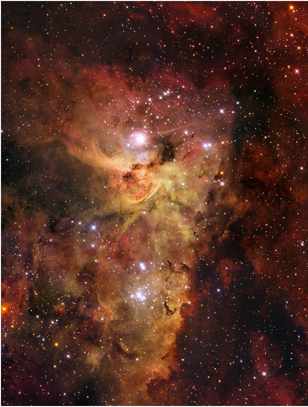 Arriba vemos la imagen más detallada de esta nebulosa que se ha tomado jamás. Es una de las imágenes más espectaculares captadas hasta la fecha por el telescopio Very Large Telescope (VLT) del Observatorio Europeo del Sur (ESO). En la toma se puede definir con extrema claridad las aglomeraciones de gas, polvo y estrellas jóvenes que forman la nebulosa, una inmensa guardería estelar que alberga las estrellas masivas más cercanas a la Tierra, así como algunas de las más pesadas y brillantes.