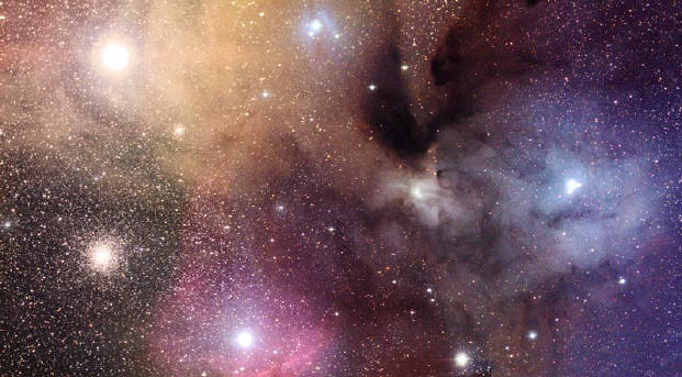 Las espectaculares nubes de color en torno a Rho Ophiuchi ocultan muchos de los procesos que ocurren allí. Las regiones azules brillan principalmente por la luz reflejada. La luz azul de la estrella Rho Ophiuchi y estrellas cercanas se refleja mejor que la luz roja. Las regiones rojas y amarillas brillan principalmente debido a la emisión del gas atómico y molecular de la nebulosa. La luz de las estrellas azules cercanas - más energética que la brillante Antares - chocan con los electrones del gas y lo encienden al recombinarse con el mismo. Las regiones oscuras las producen granos de polvo, nacidos de las atmósferas de estrellas jóvenes, que bloquean la luz de las estrellas situadas detrás de ellas. Completa el marco, el cúmulo globular M4, visible a lo lejos, hacia el extremo inferior izquierdo. El resto de radiación de la zona va desde las ondas de radio hasta los rayos gamma: un verdadero caldero cósmico.