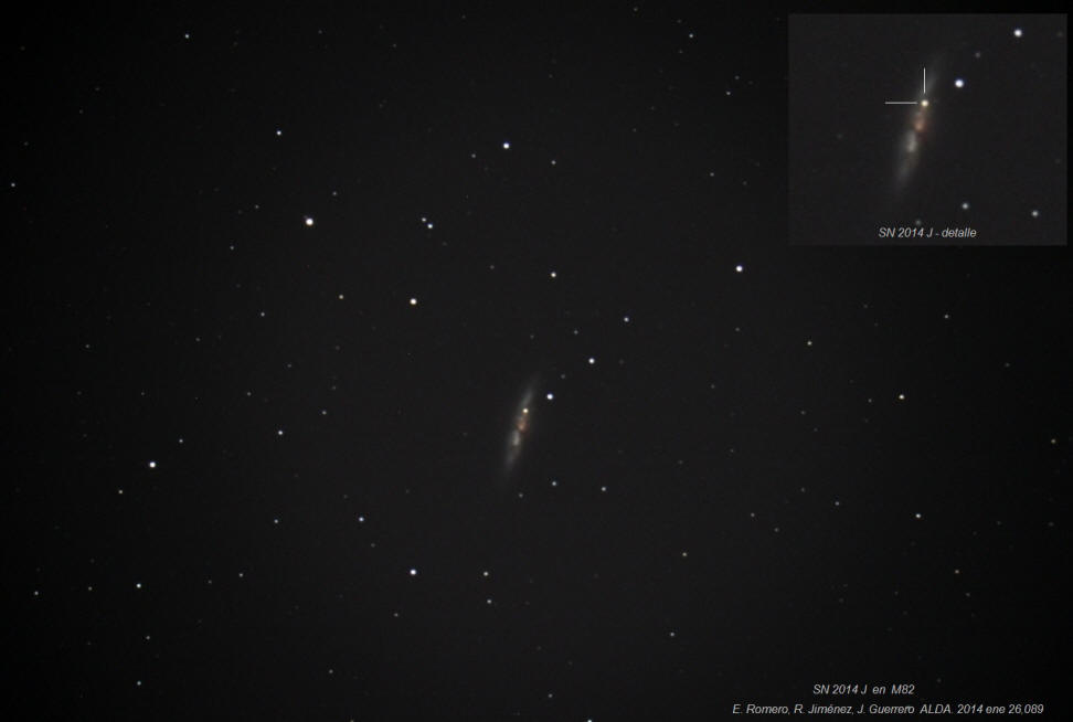 Imágenes tomadas con tiempos de exposición entre 3 y 5 minutos revelaron el descomunal estallido: La Supernova ya casi brilla como la galaxia que la contiene. M82, catalogada también como NGC 3034, tiene una magnitud visual de 8m,4 y nosotros calculamos la magnitud visual de la Supernova en 11m.