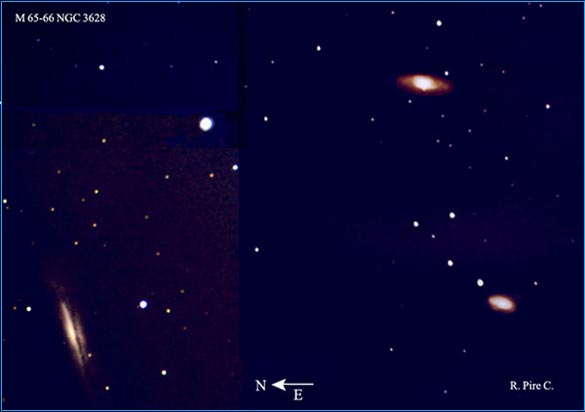 Arriba, a la derecha, M65 (NGC 3623), debajo M66 (NGC 3627) y en la esquina inferior izquierda NGC 3628, una que no consta en el Messier, pero cuyo disco de perfil nos luce la más interesante de este conjunto a 35 millones de años-luz.